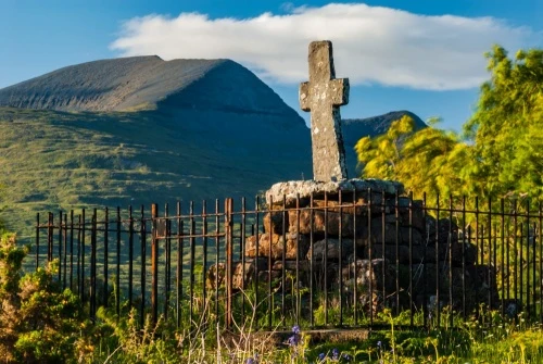 Rising from a stone base, a free-standing Latin cross looks north over Loch Scridain from an enclosure framed by metal railings, just west of the Free Church of Pennyghael on the road from Pennyghael to Bunessan. The cross probably dates to the 8th century, but was later reused as a memorial to the famous Beaton family of physicians who lived at nearby Pennycross in the 16th century.