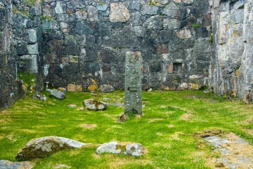 The chapel is well worth visiting for two beautifully-carved 17th-century grave slabs set into the ground outside the chapel wall and a Celtic cross-shaft that stands inside the roofless ruin.