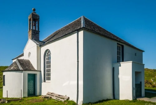 The Scalasaig Parish Church is a pretty whitewashed Georgian church, built as a chapel of ease, erected in 1802. The church is built to a very simple rectangular plan, with round-headed windows under a slate roof.