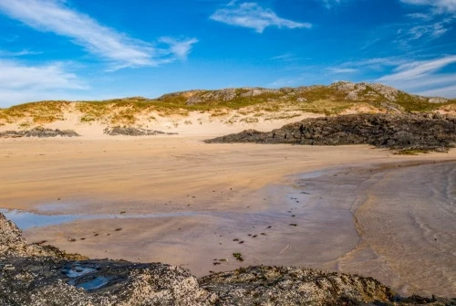 Though small, the Isle of Colonsay is blessed with some of the best beaches in Britain. The most popular beach on the island is Kiloran Bay, a beautiful stretch of pure white sand facing west towards the Atlantic, but if you are willing to stretch your legs and take the farm track past Kiloran Bay for three miles, through some of the most beautiful landscape in the Western Isles, you will reach the beach at Traigh Ban, near Balnahard, which is every bit as enjoyable a destination, and has the advantage of being more sheltered and peaceful than its more popular counterpart at Kiloran.