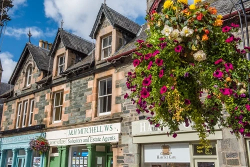 A few miles west of Aberfeldy on the road to Kenmore is Bolfracks Garden, a wonderful hillside garden built around an 18th-century house once used by the factor of Taymouth Castle. Bolfracks offers stunning views across the Tay Valley and incorporates an early 18th-century mausoleum of the Menzies family. The garden is best known for its unusual plant species and features a rose garden and lush herbaceous borders.