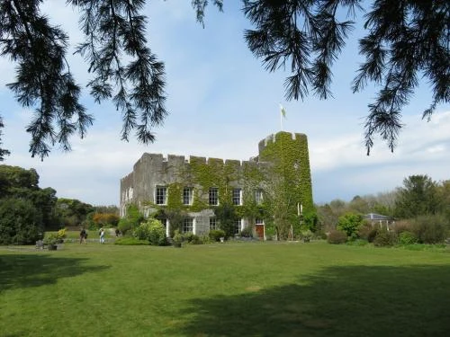 The castle stands in attractive grounds, with a woodland area behind the house, and a walled garden featuring colourful borders, rare trees, and flowering shrubs.