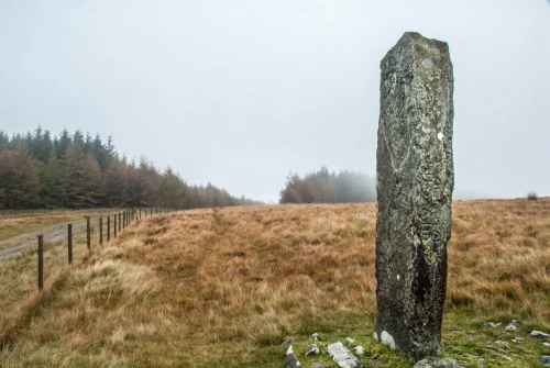 You are now following the course of Sarn Helen, an early Roman Road linking the outposts of Coelbren and Brecon Gaer. The track is roughly cobbled for most of its route as it climbs through the forest, past the site of a 1st-century Roman military camp, until it emerges into open ground at the southwestern edge of the forest. Immediately after the track leaves the forest you will see Maen Madoc in the field to your left.