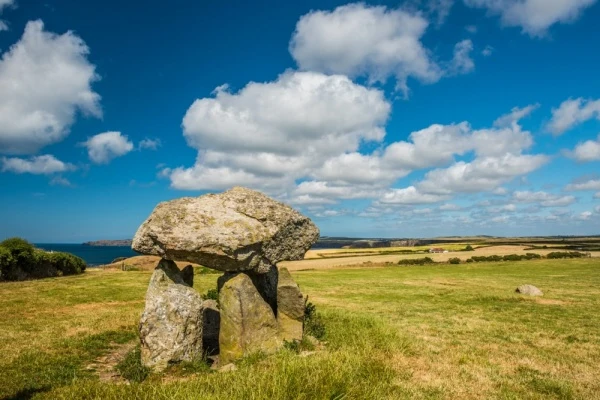 In a dramatic clifftop location just outside the pretty port of Abercastle stands a Neolithic burial chamber known as Carreg Samson. The name translates as 'Samson's Stone' and refers to the legend that St Samson placed the huge capstone in place using just his little finger.