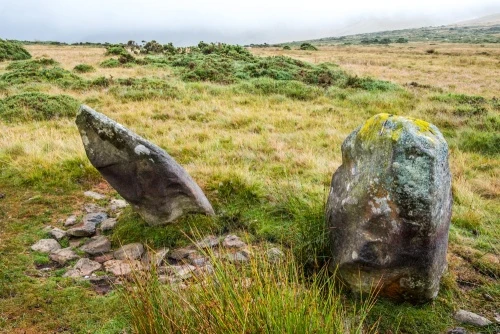 From the layby simply go through the gate and walk up the public footpath, which follows the obvious farm track, heading west. You will see the two standing stones off to your left after a few hundred metres. There are no signs, but the stones are easy to spot if you keep alert. There's no real path to the stones, and the moor will be muddy after rain, so be smart and wear good waterproof footwear.