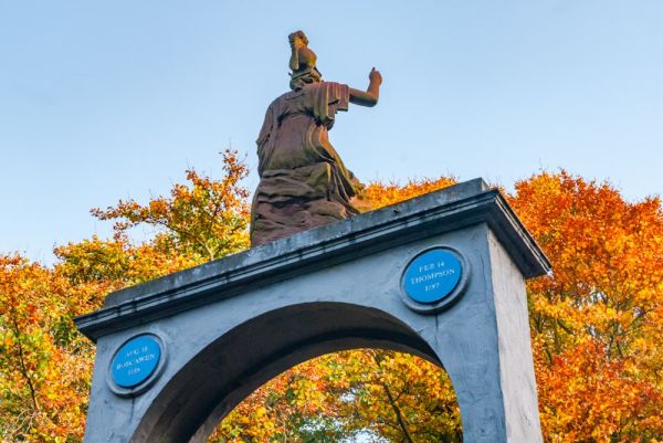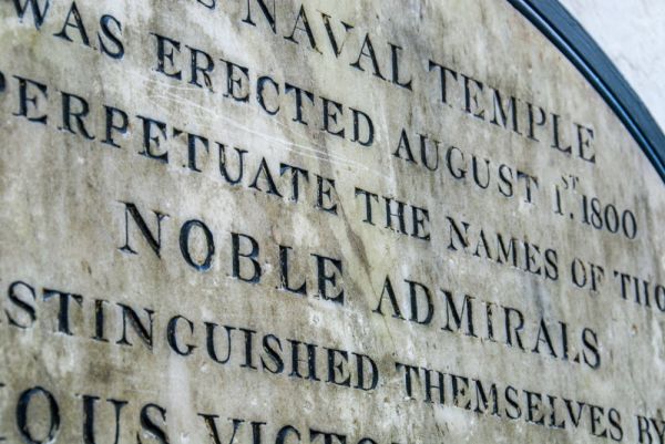 The neo-classical Temple is topped by a bronze figure of Britannia. It was dedicated by the Duchess of Beaufort, daughter of Admiral Boscawen, one of the Admirals mentioned on the memorial. There are four oval plaques on each side of the memorial base, each commemorating a specific Admiral and the battle for which he is chiefly remembered. The Admirals named on the plaques are:
