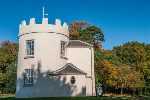 The banqueting house was erected in 1794 on a prominent viewpoint atop Kymin Hill, offering wonderful views over the Wye valley and extending to 9 counties on a clear day. It is composed of a round, two-storey tower with a crenellated roof, with two small additions to the rear.